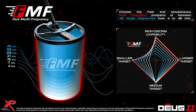 Уникалното при многочестотната технология на XP – FMF е, че при едновременната работа на много честоти, които се сменят със светкавична скорост, XP Deus II изчислява супер бързо и грешката определена от минерализацията, като я коригира и като резултат има по-добра дискриминация в по-тежки почви. С две думи многото честоти не само засичат едновременно целите, но и определят грешката на земята породена от минералите в нея. Това е уникално и го отличава от другите многочестотни модели.
